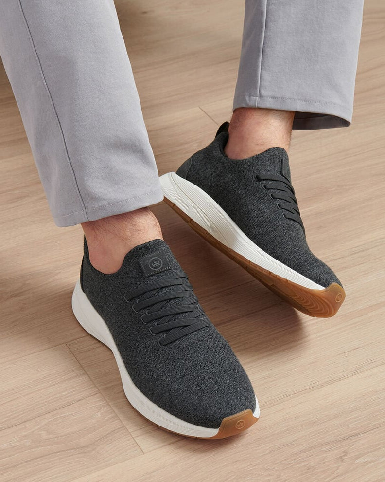 Dark gray sneakers with white soles and brown accents worn on a wooden floor.