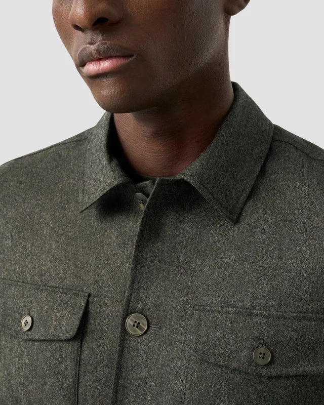 A utility-style overshirt crafted from premium Super 120s Merino wool flannel, woven by heritage Italian weavers. The naturally breathable, thermo-regulating fabric offers exceptional softness and comfort—ideal for layering during cooler months. Designed in a regular fit, it features two chest pockets, side-entry pockets, and a subtle branded leather patch. Matt buttons and a lightly lined front complete the clean, structured silhouette.