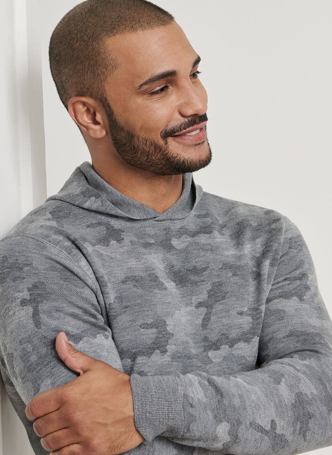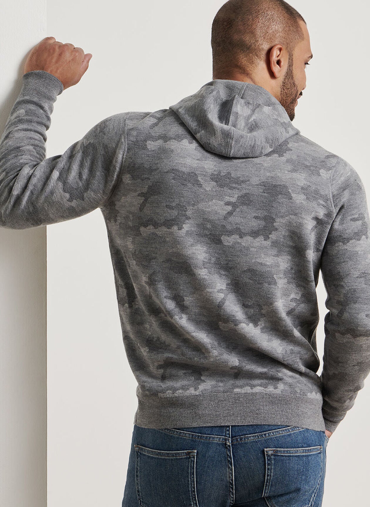 Made from luxurious Merino wool, this hoodie provides warmth and softness with every wear. It features a unique camo print on the exterior for added style. Finished with rib-knit cuffs and hem.